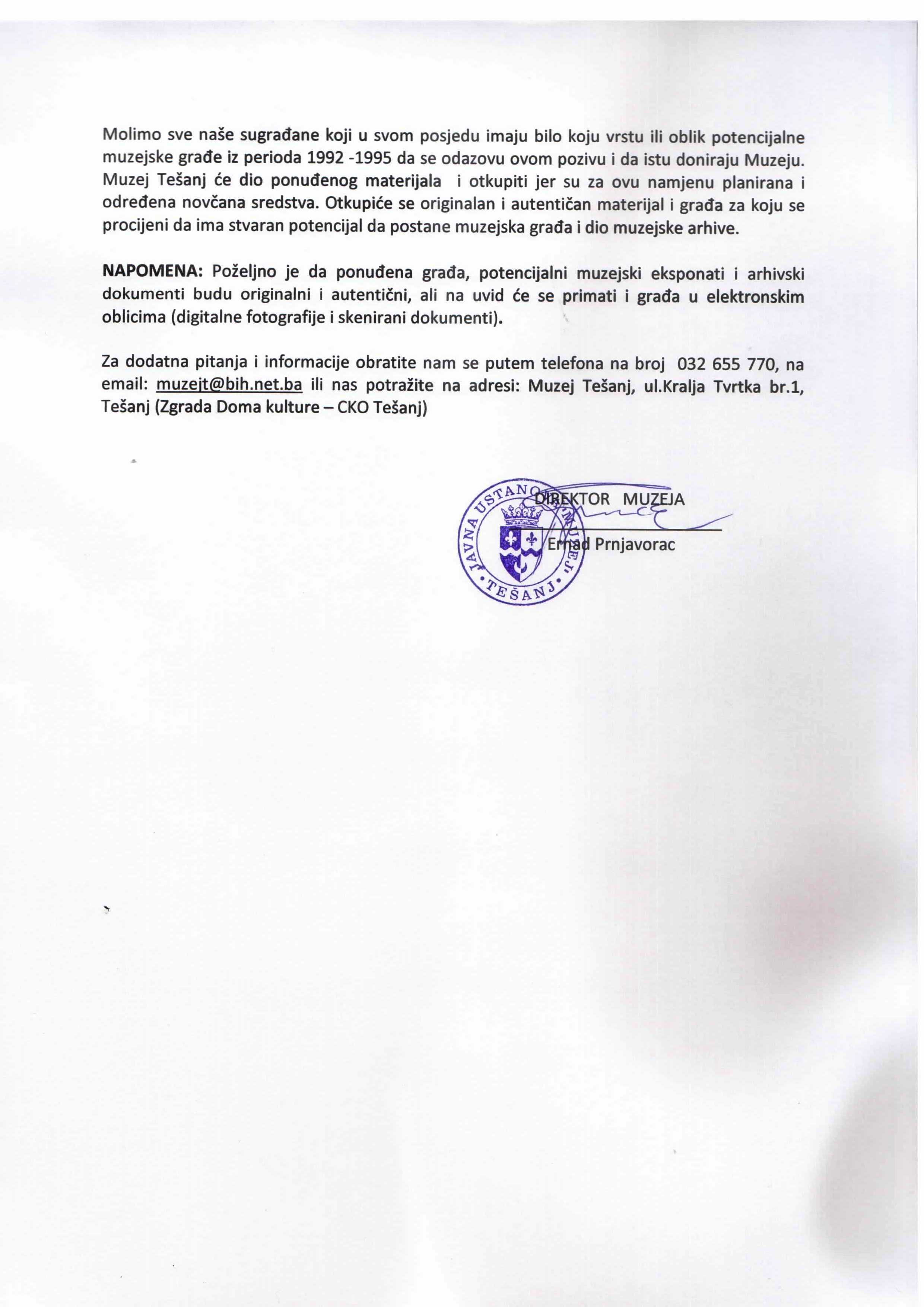 Javni poziv za prikupljanje muzejske građe iz perioda 1992 -1995