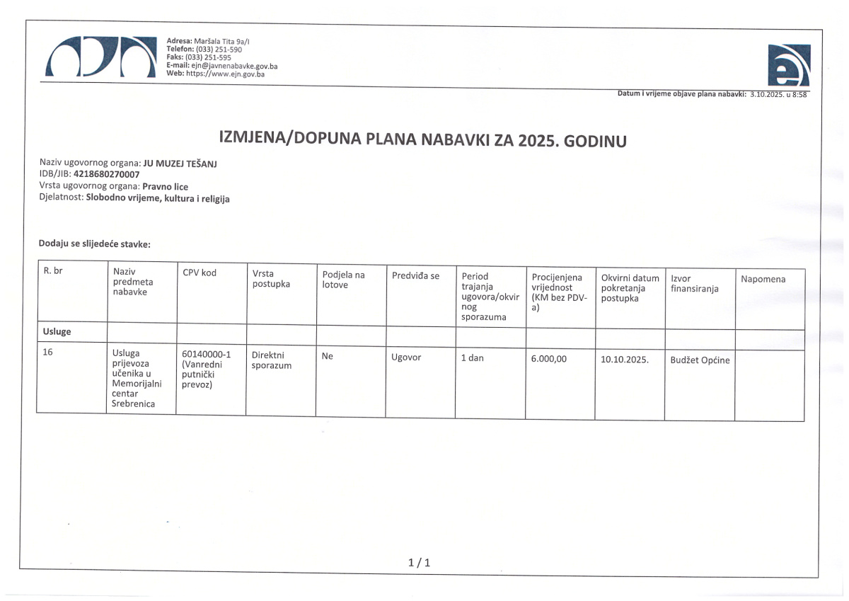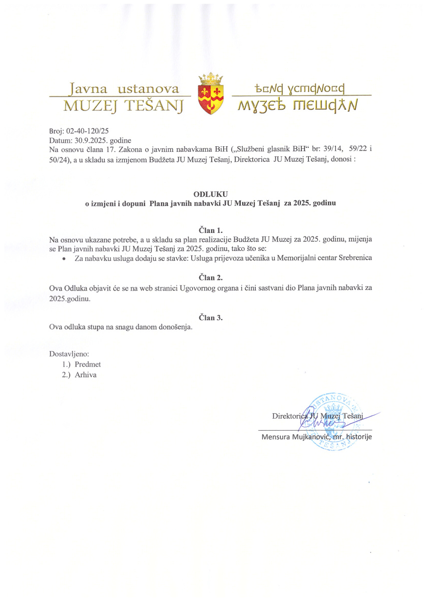 ODLUKA-o izmjeni i dopuni Plana javnih nabavki JU Muzej Tešanj za 2025. godinu